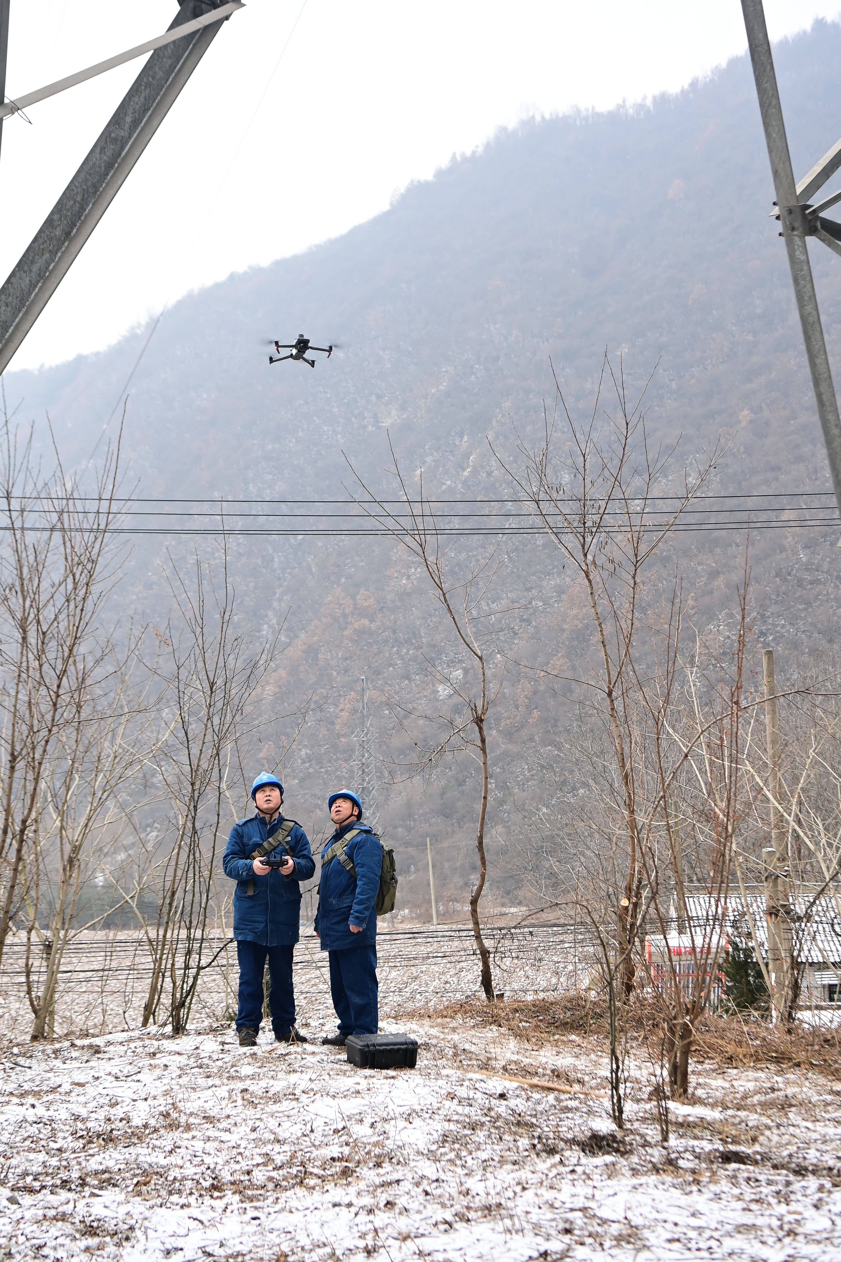 国网宝鸡供电公司输电运检中心秦岭输电运维班班长周红亮(左)、副班长令云在宝鸡市凤县黄牛铺镇东河桥村近邻使用无东谈主机检查澄莹覆冰情况。新华社记者 邹竞一 摄小小一座变电站,何如消融6.5公里长的澄莹区段上的冰雪?
